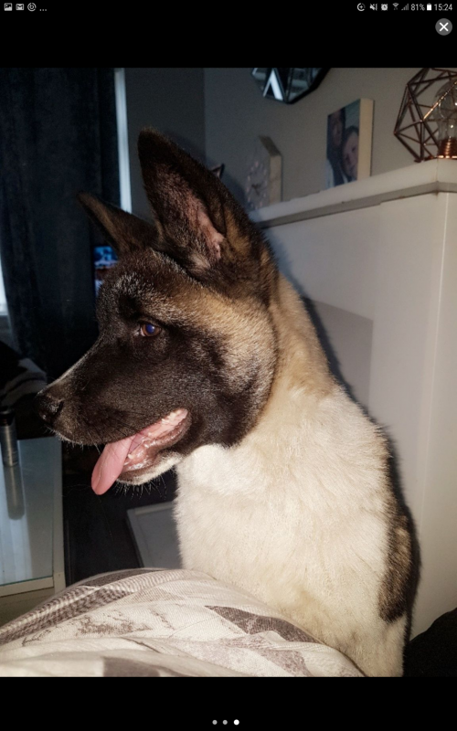 She lived with her mum and dad the ownerthought they could handle 3 American akitas but 3 is too much she is good with kids and other dogs I'm going too see her tomorrow and see if not I will be sticking with having a pal for Rocco that s 100 %