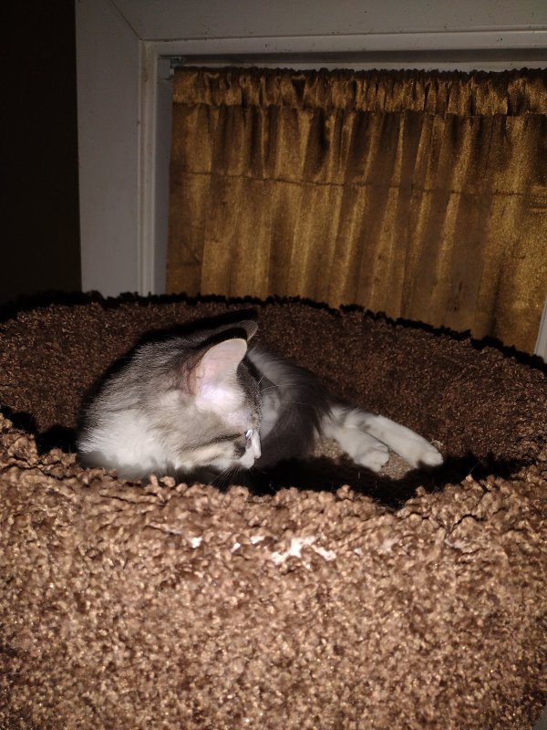 Meanwhile, Panther is growing into a gorgeous cat. She loves her dayroom - she and Looney1 are sleeping in there every day. Punx is doing great. She gets spayed on the 30th. She is known as the Mongoose because she poofs out her tail straight up like Rikki Tikki Tavi when something catches her attention. Both girls love getting neck scratches.