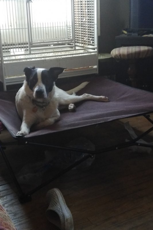 I found a dog cot for Cat-dog. It is a Coolaroo brand and it folds up like a camp chair. I got the XL size - it is big enough for Cat-dog to lay on straight out (she doesn't bend in the middle that well). It arrived this weekend and I set it up in the living room. I convinced her to lay on it a couple times, but Tornado-dog gets all excited and jumps on her, and she still isn't comfortable that far out in the living room, so she immediately gets up and goes back to her hallway... Meanwhile, someone is attempting a theft... He now has his toys strewn all over it and he will go play with them on it - when he's not sticking his toys in my face so I'll "go for them" (he really enjoys taking them from me).