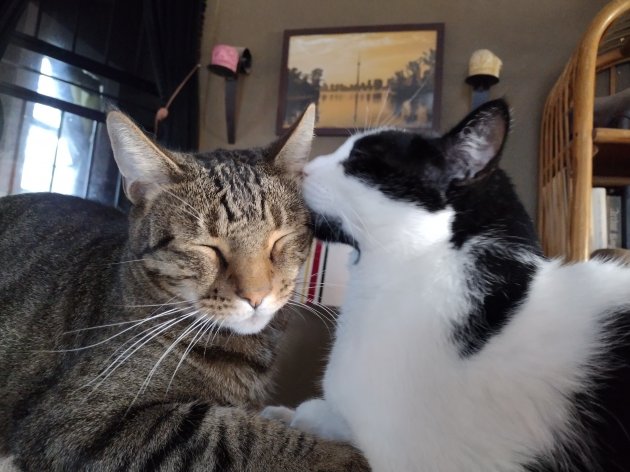 I decided to arrive after 2:30 today to the adoptions. The kittens were all there already, so I just needed to pick up those not adopted. When I arrived, Calvin had already been adopted. Over the next 1-1/2 hours, Luke, Bo and Daisy all got adopted. Rabbit had lots of attention. But he, Andrushka and Panther came home with me for the week. Upon arriving home, Andrushka gave her Uncle Looney1 a big cat rub. Apparently, they missed their uncles as much as their uncles missed them. The little ones are all happy now too. So until next weekend, we are kicking back for the week.