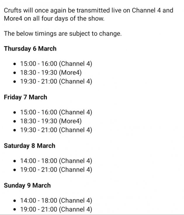 The groups covered are: Thursday 6th. Hounds and Terriers Friday 7th. Toys and Utility breeds Saturday 8th. Gundogs Sunday 9th. Working and Pastoral breeds. There is some Crufts coverage on YouTube too.