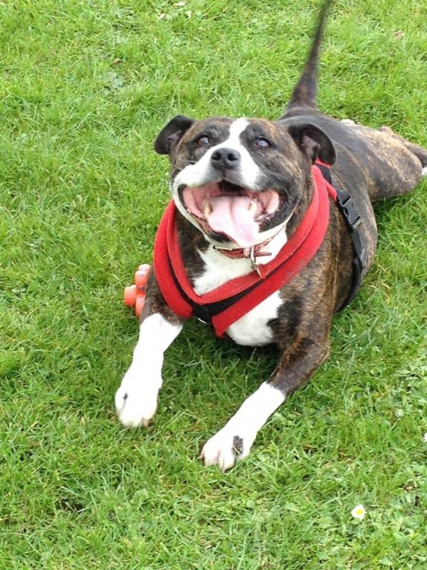 This is Diva , I rescued her from a Free Gumtree ad nearly 3 years ago now. My vet thinks she's about 8 yrs of age. She is the most happiest staffie I've ever had, she's just great.
