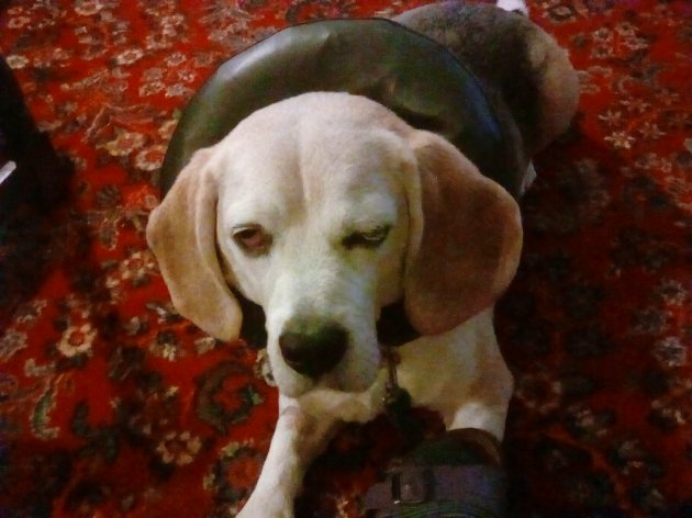 Eddie has almost gone mad attempting to claw at his eye today. The blue collar is too big and too floppy to let him settle in his bed, so we needed an alternative. Chas ran down into Stoke to try to pick up a Buster inflatable collar for him, but he couldn't get one, and came home with a Thrive inflatable collar. To cut the story short, Ed can still reach his eye with the new collar on, it may be OK for walks, but Ed is back in the big blue one tonight. I'm exhausted already, and still.another week to go before we see the vet again! A picture of Beagley misery. Even his good eye looks inflamed.