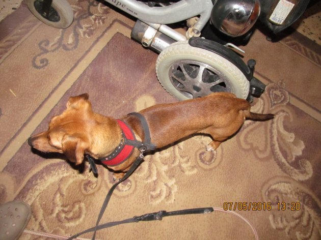 Shoulder muscle? Her rear thigh muscles would give Kim Kardashion a run for her money! Well she will do her Meerkat impression when she is outside so she can see a bit further, and dances on her hind legs! Tikki weighs 5.5kg - was just about 450gm when I brought her home at 3 weeks old [I know, I know, she was far too young but still...] But she really is skinny apart from her muscles - you can see all her ribs and frequently all of her spine shows. She is broad and deep chested and has a waist to die for - and not one of the photographs I took really showed her shape. If you compared her with the size chart she definitely looks underweight. Ah, but she is a healthy little booger and Michal, her primary vet, reckons that her weight is mainly in her bones and muscles. As she is a Doxie/Minpin cross, both breeds tending to gain weight, I am very happy with her weight and size, especially since she was spayed when she was 6 months old. Her dam was the largest standard Dachshund I have ever seen, and when Michal first came here to check Tikva and sort out her worming and vax dates, she thought that Tikki would probably end up around 10kg. Boy was she wrong! But as she says, Tikki is much healthier at this size and weight. But I think she is allergic to the camera as it is impossible to get a decent photograph of her standing. Little Booger!